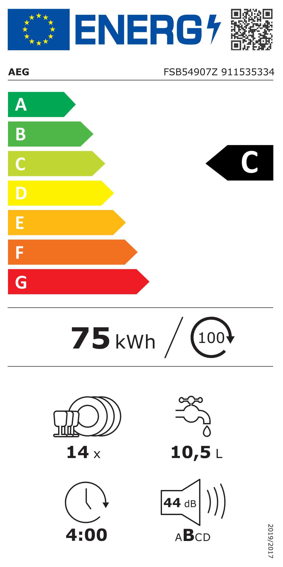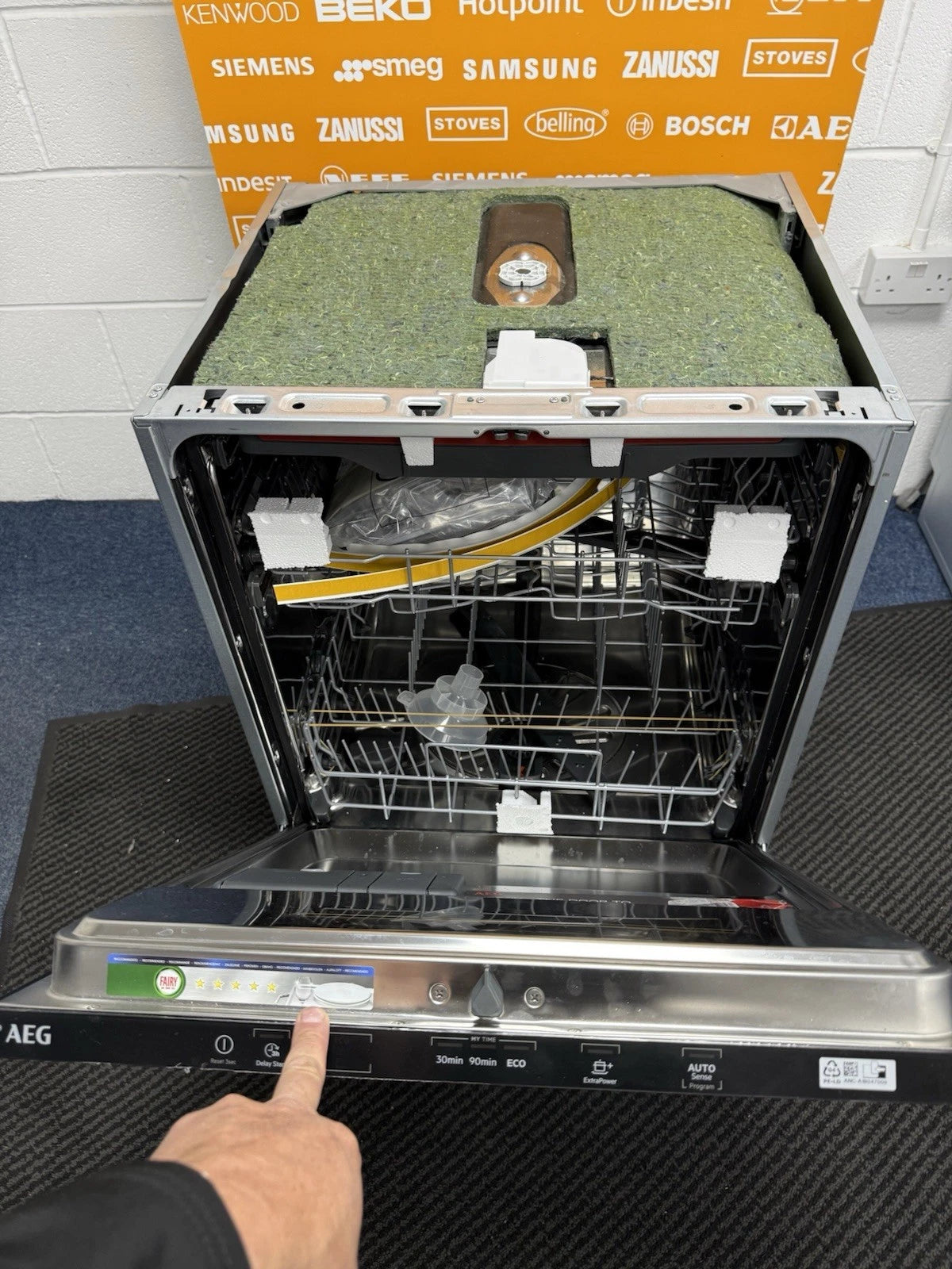 The AEG FSB54907Z is a 60 cm built-in (fully integrated) dishwasher from the AEG 5000 series, offering 14 place settings, AirDry drying, and advanced functionality to suit modern kitchens.