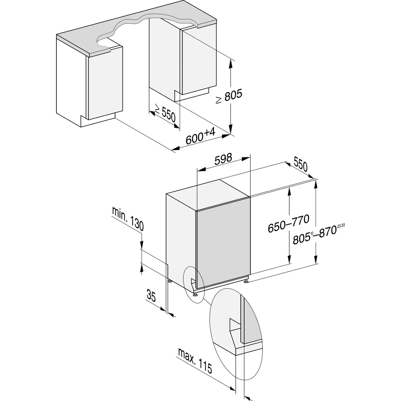 Dimensions (approx): H 805–870 mm × W 598–600 mm × D 550–570 mm