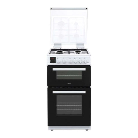 Hostess Freestanding Natural Gas Cooker 50cm Twin Cavity with Glass Lid in White. LPG Convertible