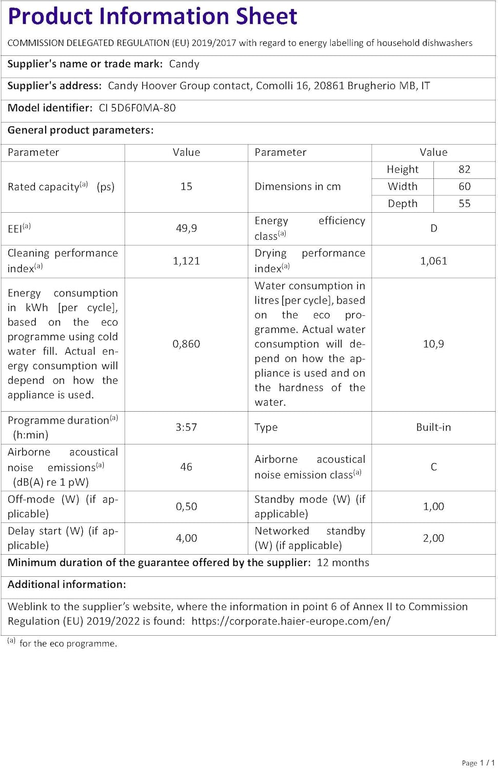 Energy Efficiency Class: D (A–G scale)