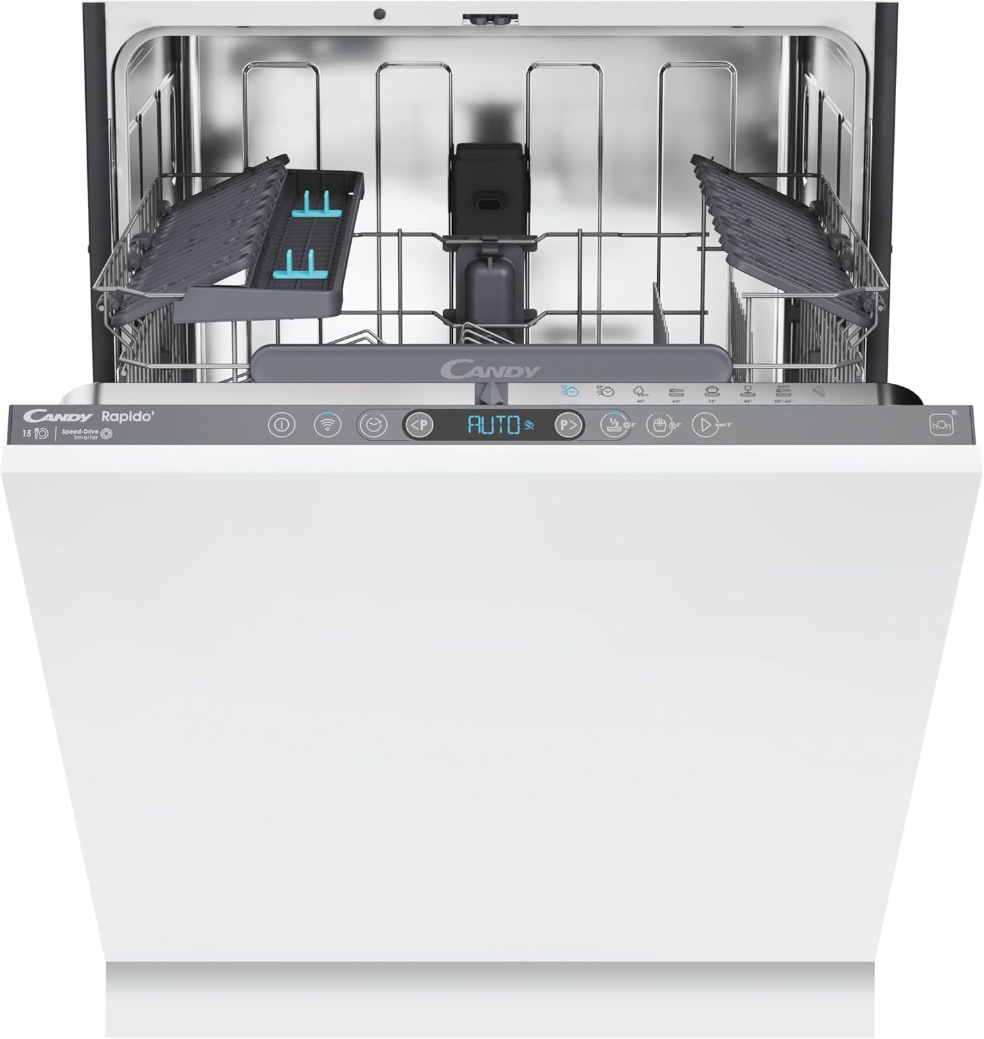 • The Smart door opening system can be selected on all the washing cycles of the new Candy Rapido'. During the drying phase, the door will automatically open a few centimetres. This will enable the air to circulate within the dishwasher in order to allow the natural drying of the dishes. The duration of the selected cycle will change to allow optimization of any temperatures used during the rinse phase and will provide a significant reduction in energy consumption.
